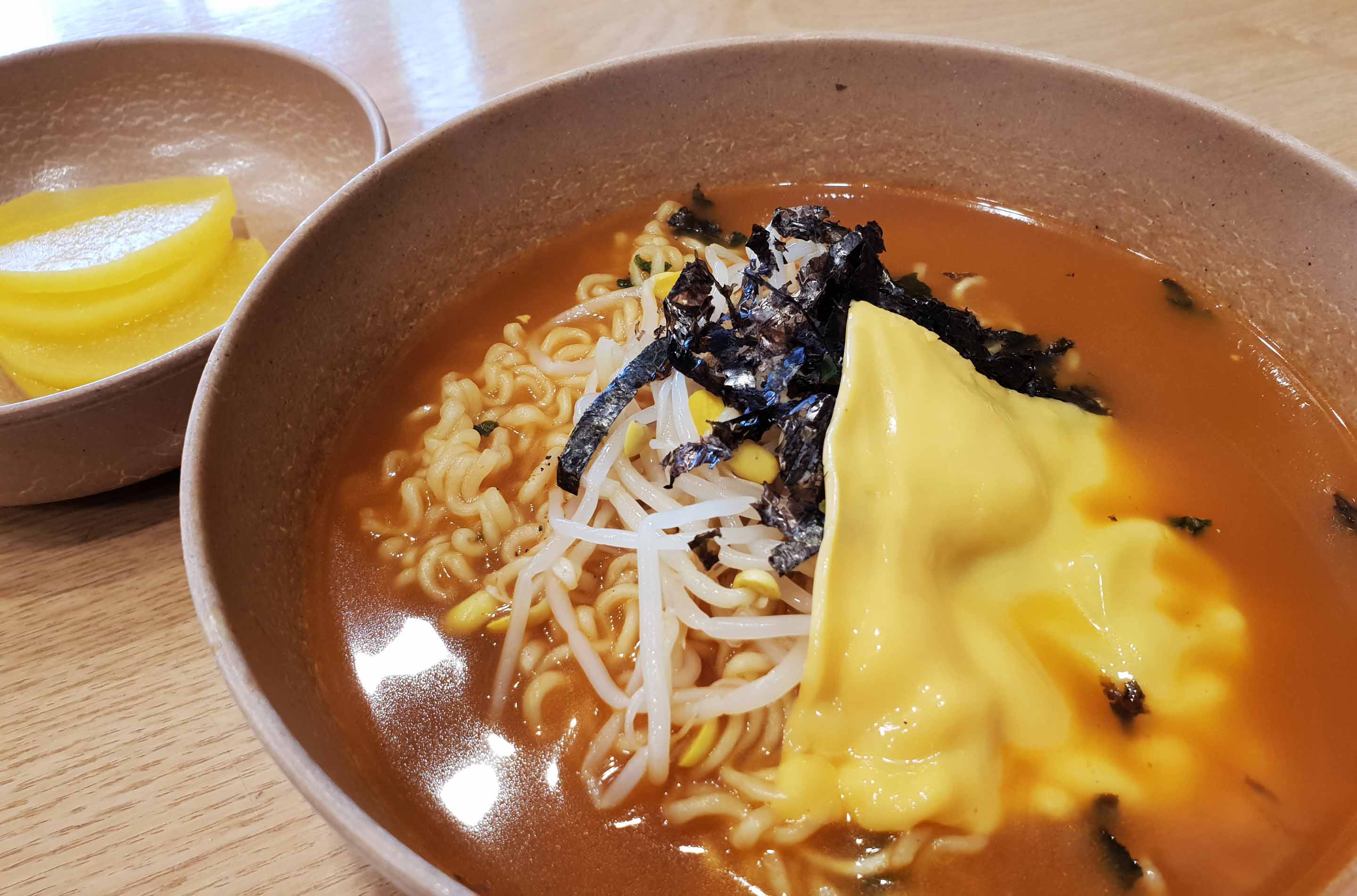 另外也很常吃「起司辛拉麵」,簡單的辛拉麵鋪上一片起司,漸漸融化以後湯頭變得超濃郁,雖然在店面吃比自己買的貴了些,但無限吃的醃蘿蔔和泡菜以及冰水,配上餐點也是另一番滋味